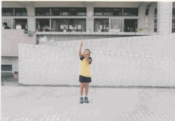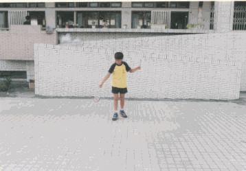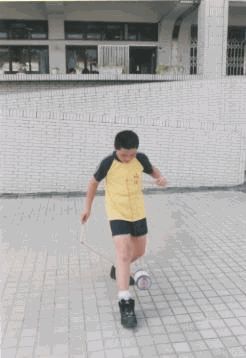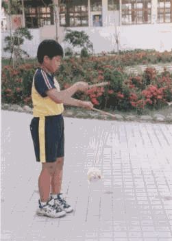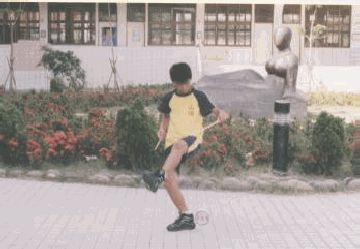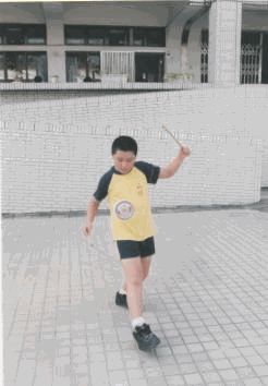 動作要領: 1.身體右轉成開線,兩棍端微微相對,棍子並與身體平行, 右棍低,左棍高。 2.右棍往上,左棍往下,將線拉直,鈴會自動跳起來。 3.右棍由上向下方對準鈴軸心直劃,就可以勾到鈴軸。 4.在右手套接鈴之同時,左手順勢向後,兩手之動作如同兩 腳踏腳踏車之動作 。 |
