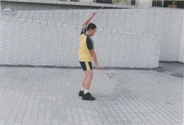 動作要領: 1.成開線V型,迅速將鈴吊向右上方,使兩棍在胸前成直立並平行。 2.兩棍同時由鈴下甩過,一左一右交互甩動。 3.待鈴速趨緩後,再回復運鈴姿勢。 4.左右逢源講求輕巧,千萬不要太用力甩動。 |